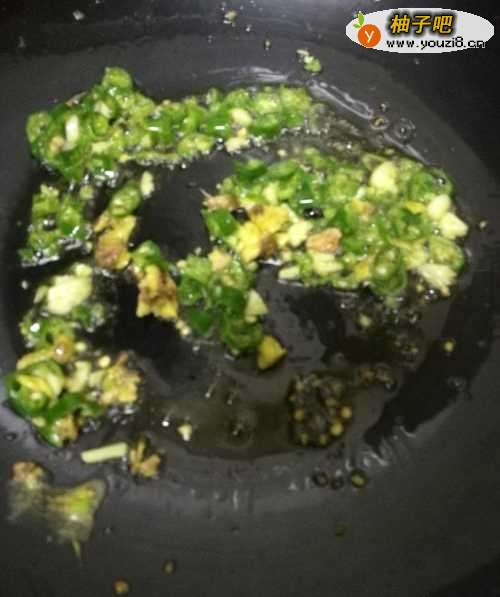 5再在锅里倒入点油,把辣椒跟姜蒜放进去翻炒,把春笋放进去。