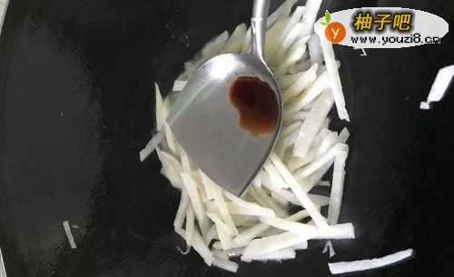 3接着放点酱油和盐,调味。继续翻炒均匀哦。凉薯生的也可以吃,不用炒太久的。