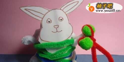 然后,取两根白色毛根缠绕在纸杯上,弯曲的一段作为兔子的手和脚,如下图所示。
