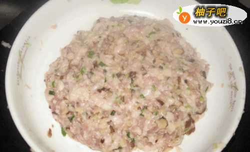4将所有材料混到肉馅里,然后加盐、胡椒粉、料酒、生粉拌匀,然后往一个方向搅拌一会儿。