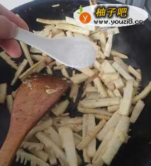 2热锅下春笋,中火就可以了,炒到微微发黄才行(烧笋一定要炒透了才好吃)这步骤我觉得是比较重要的!一定要中火多炒一会,这样才能把笋的涩味炒掉
