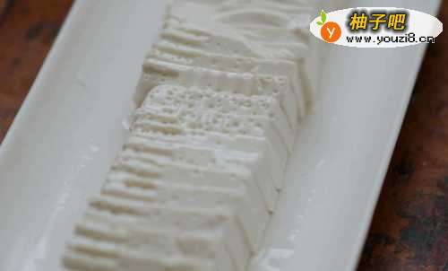 5将豆腐切成均匀的片。