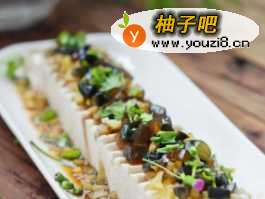 7将切好的榨菜粒放在豆腐上。