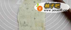 7案上抹些油,将饧好的面团擀开(不用干粉,只用油,这叫做油案),然后均匀地抹上过程“6”调的葱油酥。