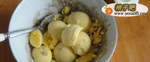 4将蛋黄取出,将蛋黄酱,寿司醋(白醋),青芥末,黑胡椒粉,适量盐(也可不放)混合均匀