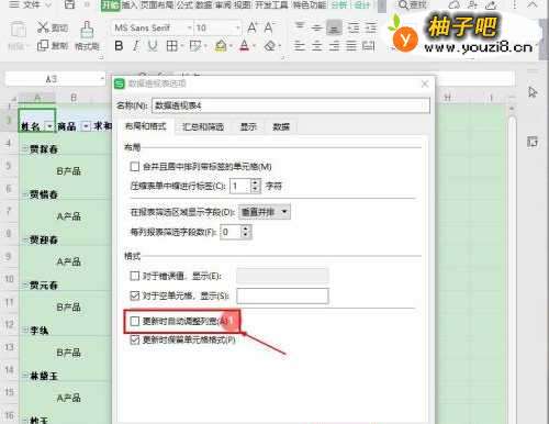 4在“格式”功能区,取消勾选【更新时自动调整列宽】,然后点击【确定】即可。