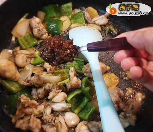 4加入青椒继续兜炒,加入一汤匙麻辣酱和适量花椒油兜炒。