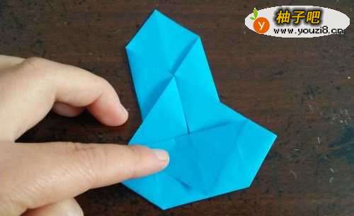 6再把两侧的角回位,把顶上的两个角向两边折。把外边的角都向内折,然后用胶水把心形粘在小熊的身上即可。