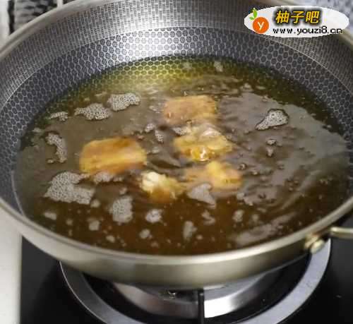 5之后把排骨放入5层热的油锅里面,用小火慢炸,炸到金黄捞出控干油。