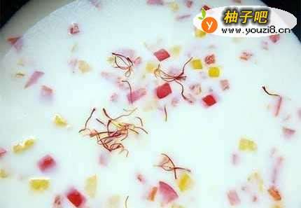 3原锅倒入彩椒丁略炒,加入牛奶、水及番红花后,盖上锅盖煮滚。