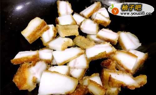 4烧热锅,不需要放油,把切好扣肉放入锅里,用中火将肥肉煎制出油,吃起来才不会那么油腻。