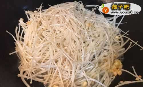 5倒入金针菇,炒约3分钟至金针菇变软。