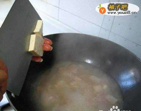 水烧开后,一手托着豆腐,另一只手拿着刀,把豆腐切块状入锅中