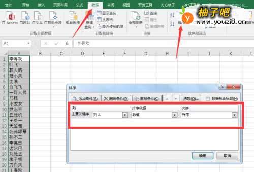 2. 接下来选中名单列,选择 数据 >> 排序 >> 确定 ;