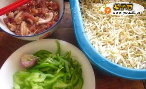 肉用姜丝盐料酒腌制至少五分钟,青椒洗净切丝,绿豆芽浸泡除去豆皮