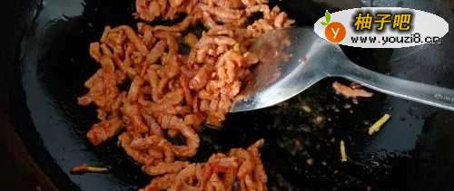 5锅离火,放入腌好的肉丝,滑散再将过放回灶上,大火炒至变色