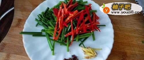 将韭苔切段,红椒切丝,姜切丝备用