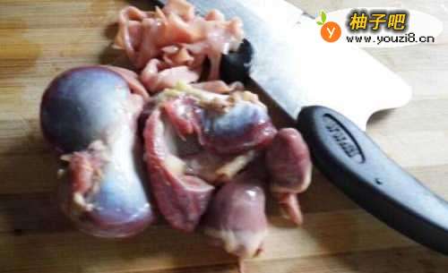 鸡胗、鸡心、鸡肝切成片,鸡肠切成长段,加入盐、料酒,小苏打,生粉腌制