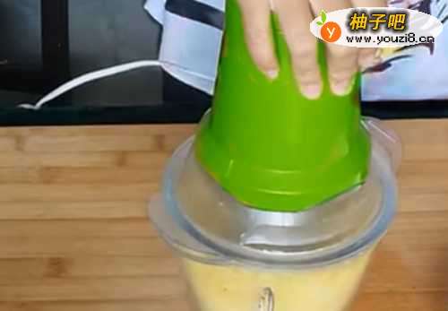 4将蒸好的绿豆仁放入料理机当中,将绿豆仁打碎,做成绿豆沙。没有料理机的也可以用勺子的背部碾压绿豆仁,直到变成绿豆沙,尽量细一些,不要有颗粒感。