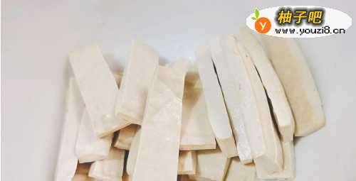 4起锅热油,把豆干净三放入锅中火煎至两面捧级金黄。