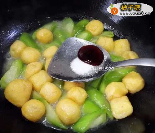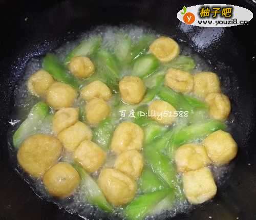 5丝瓜炒变色之后,加入油豆腐一起翻炒几下。