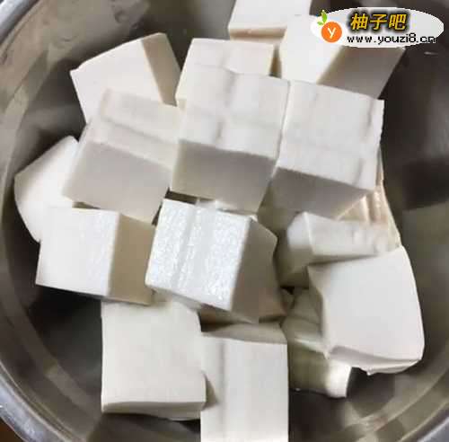 3豆腐洗净切成大块,再把豆腐放到调好的鸡蛋液里。