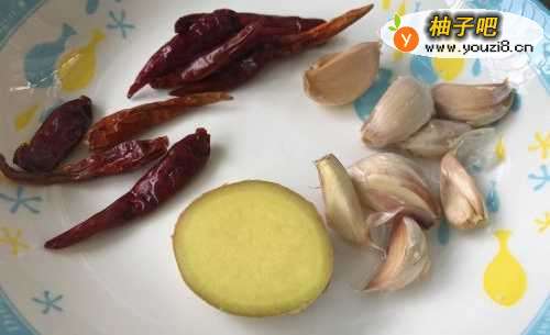 7热锅下油,下干辣椒、姜、蒜炒香,然后倒少许酱油。