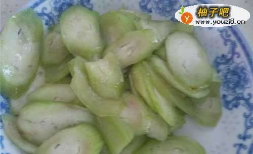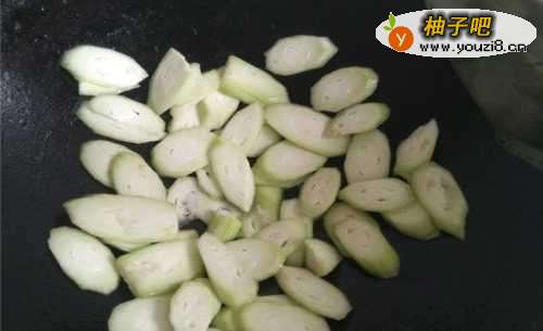 6锅中加入60毫升的食用油,将丝瓜片倒入锅中。
