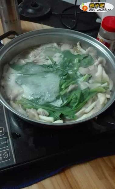 3待鸡肉炖熟时,加入秀珍菇,再熬上5分钟左右,倒入青菜煮一会,待青菜快煮熟时加入少量味精进行调味。小火慢熬一会即可。