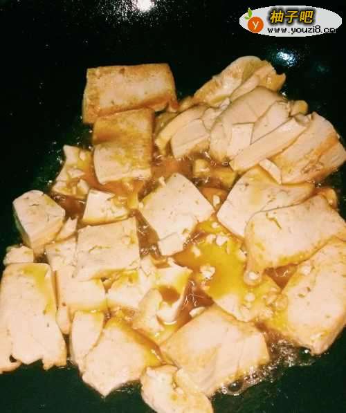6第六步:取炒锅,开火,放油,待油锅冒烟的时候,将火调至小火,放入切好的豆腐片,用铲子轻轻翻炒,待两面出现脆皮黄色的时候,关火,将豆腐盛出。