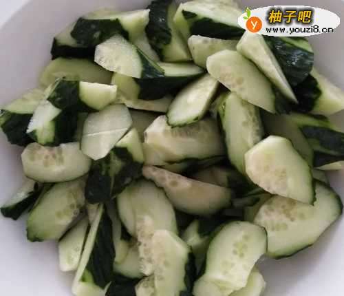 3第三步:然后将一勺白糖撒到青瓜上面,如下图所示。