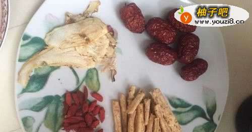 将所有需要放的配料(红枣、当归、枸杞、沙参等)全部准备好,放在一个盘子里备用。