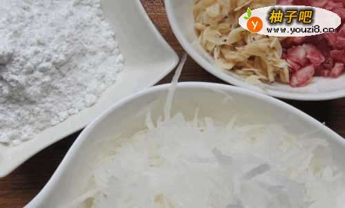 准备的材料。白萝卜刨丝,香肠切丁,虾皮洗净。