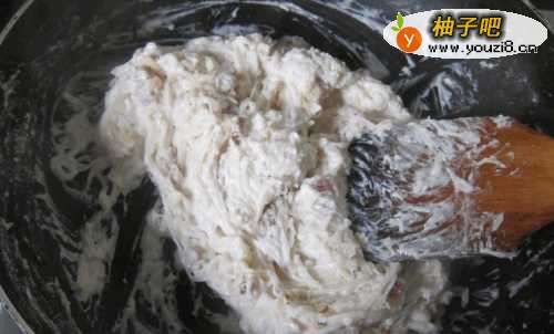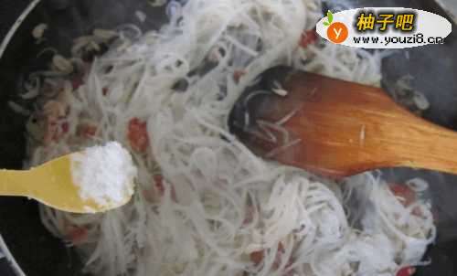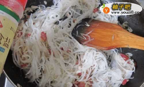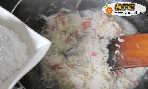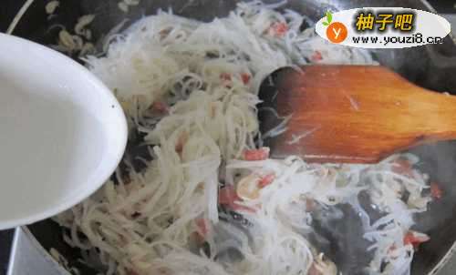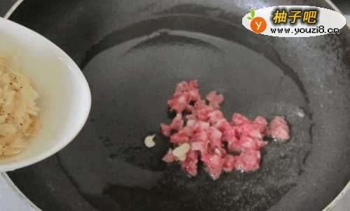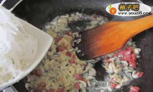 2锅中倒入适量油,煸炒香肠和虾皮。