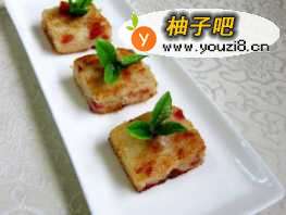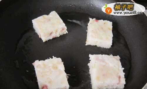 12不粘锅中加入适量油,下入萝卜糕煎至金黄即可。