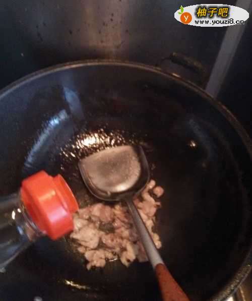 3锅中放入花生油,烧热后,放入肉片翻炒。