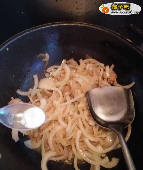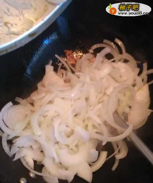 5将葱头丝全部倒入锅中,翻炒均匀。用铲子将连在一起的葱头丝分开。