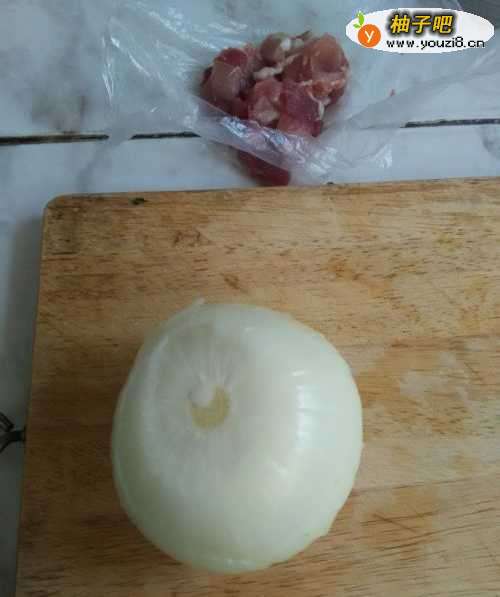 将葱头去掉外面的老皮,用刀削去两头。将肉切成肉片。