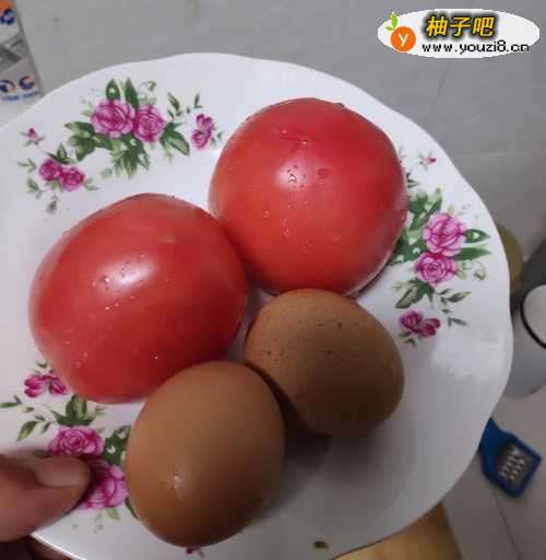 准备鸡蛋两枚,可以先打在碗里。番茄切成1-2厘米左右的方块,盛盘备用。