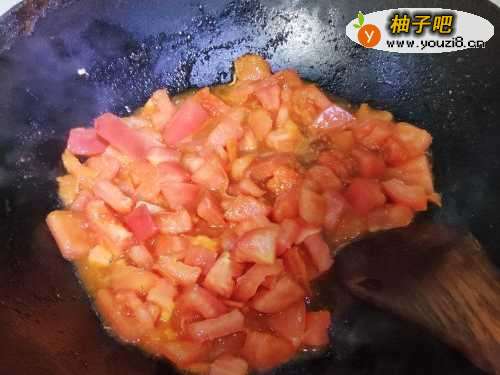 3炒番茄。在炒锅内放入少量油,可以放葱蒜等。我这里没放,直接凉油放入番茄,开始翻炒。这次不会产生油烟。
