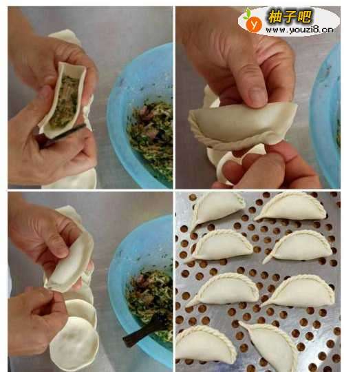 4装馅料,左手托着饺子皮,右手大拇指配合食指按压成形,锁成眉毛形。