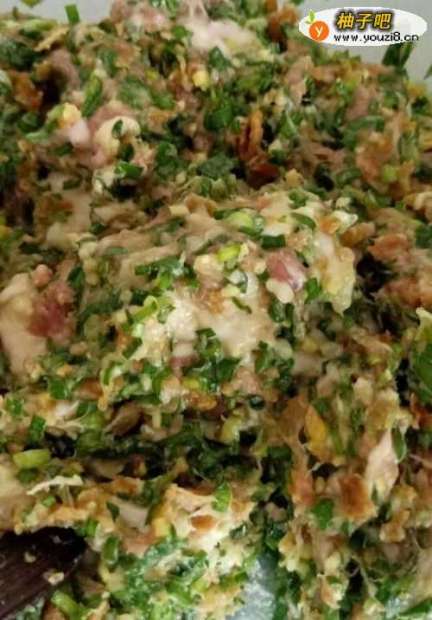 2蛋花、肉馅、韭菜加调料(鸡精、味精、盐)和匀。