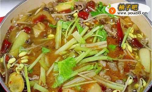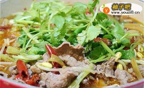 5转中火加入牛肉2分钟,加芹菜滚煮1分钟,加盐调味,淋上红油和香菜,关火上桌。
