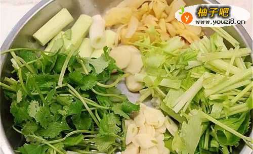 2黄豆芽去根须,芹菜切5公分小段,酸菜切丝,粉条类泡水,辛香料切妥备用。