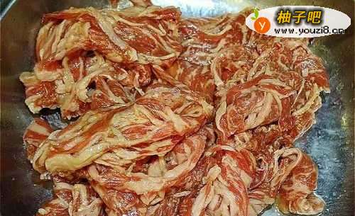 3起油锅,先把牛肉到两大匙油进牛肉碗中,热锅后倒入过油变色马上盛出。