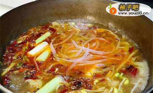 4锅内的油中小火爆香辛香料,一起拌炒出香味后,放入黄豆芽拌炒几下,加入约四碗热水,放入粉条用中大火煮滚后调味,转小火续烧5~10分钟至黄豆芽变软。