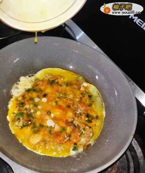 5等稍微煎定型以后,将鸡蛋液倒入 将鸡蛋煎熟后即可出锅装盘