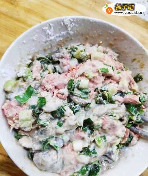 2将葱或者蒜苗切段,和地瓜粉一起与牡蛎肉搅拌均匀