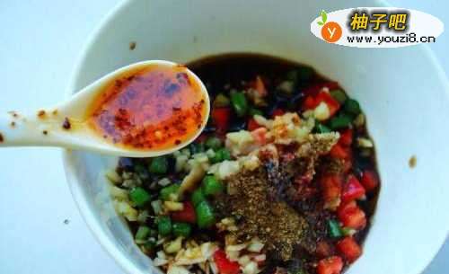 4制作调味汁:把葱姜蒜末、小米椒、盐、醋、生抽、花椒粉、辣椒油混合搅拌均匀