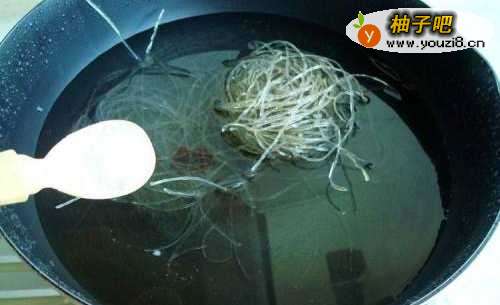 5锅里倒入适量冷水,把红薯粉条倒进去,再放适量的盐,水煮开后再添加少量冷水,等待第二次煮开,煮好后过凉水备用